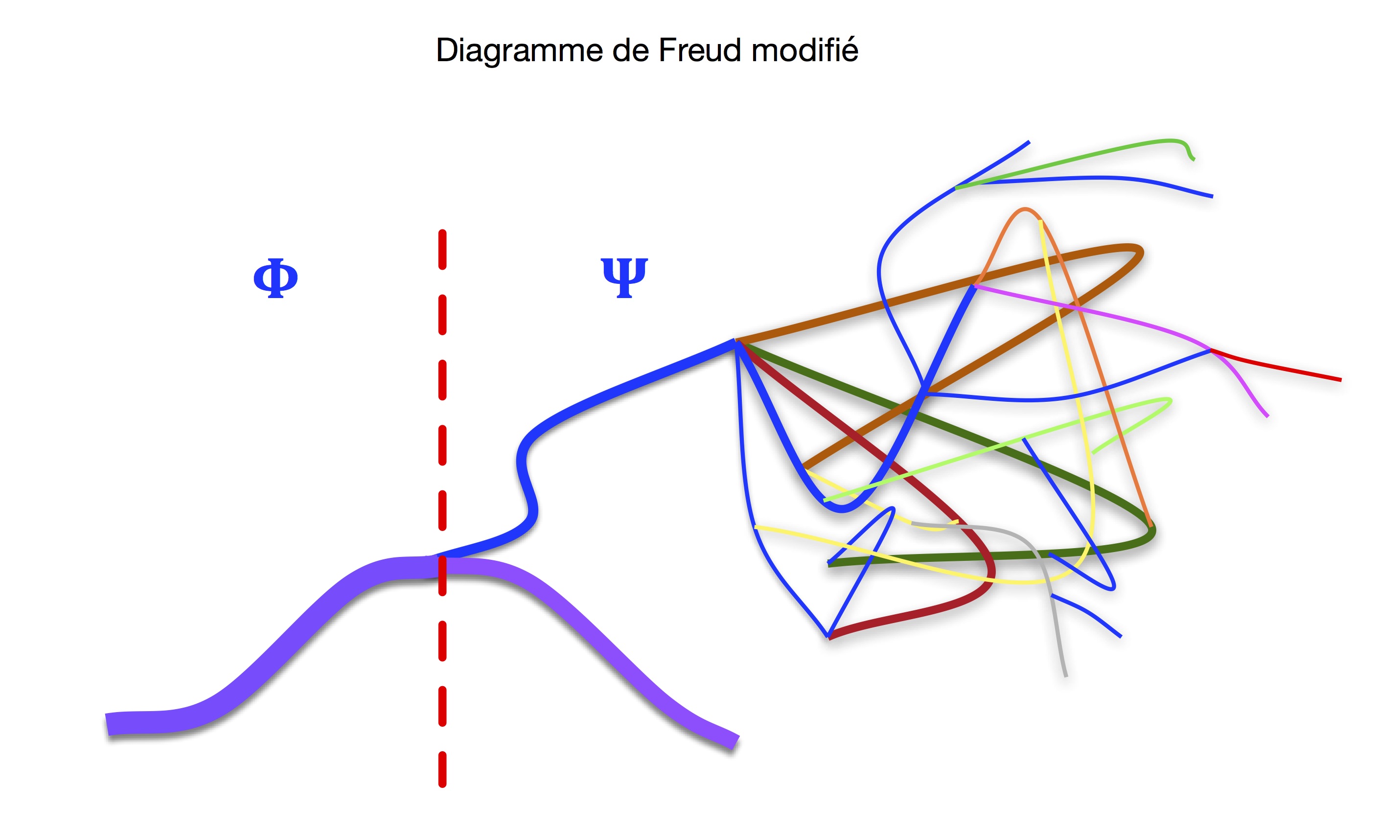Si on observe attentivement, on notera combien les deux schémas dessinés par Freud sont en fait superposables, à la différence que dans le second schéma, Freud dessine, dans la partie supérieure droite, une sorte de circuit au lieu d’embranchements ouverts. La branche inférieure reste, quant à elle, de forme simple, linéaire. Dans la section du Projet contenant ce schéma (Section 14 de la première partie) Freud introduit la notion de frayage et accompagne le dessin par une description du moi « comme un réseau de neurones investis, bien frayés les uns par rapport aux autres » (p. 631-632). Il explique ensuite que si ce n’était de « l’investissement latéral », c’est-à-dire la présence du réseau de neurones qu’est le moi, la « Quantité » se serait écoulée simplement via la branche inférieure, mais la présence du moi inhibe ce processus simple. « Si donc un moi existe, écrit Freud en conclusion, il ne peut qu’inhiber les processus psychiques primaires. » (p. 632)